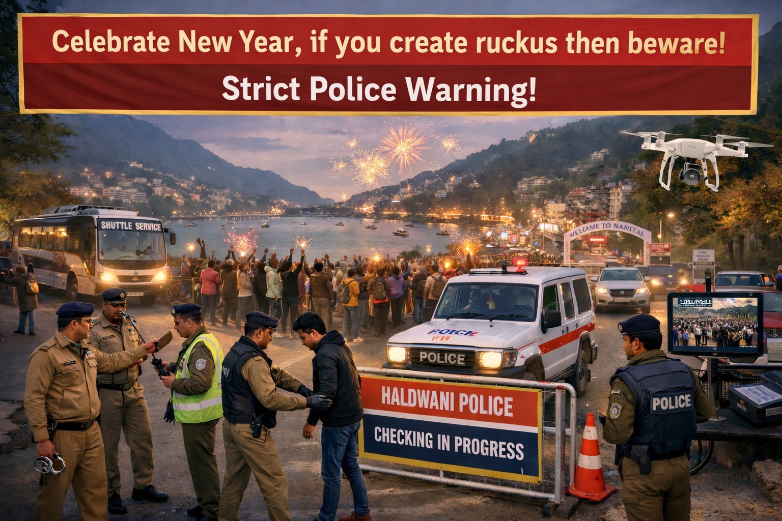 New Year in Nainital, DDC : नए साल की तैयारियां नैनीताल जिले के तमाम पर्यटन स्थलों पर जोरशोर से चल रही हैं। देश के विभिन्न इलाकों से पर्यटकों का भी पहुंचना शुरू हो गया। इधर, सुरक्षा और यातायात इंतजाम को पुख्ता करने में जुटी पुलिस ने स्पष्ट चेतावनी दी है। कहां है कि नैनीताल का जश्न जमकर मनाएं, लेकिन अगर हुड़दंग किया तो फिर खैर नही है। हो सकता है कि हुड़दंग मचाने पर नए का जश्न आपको सलाखों के पीछे गुजारना पड़े।